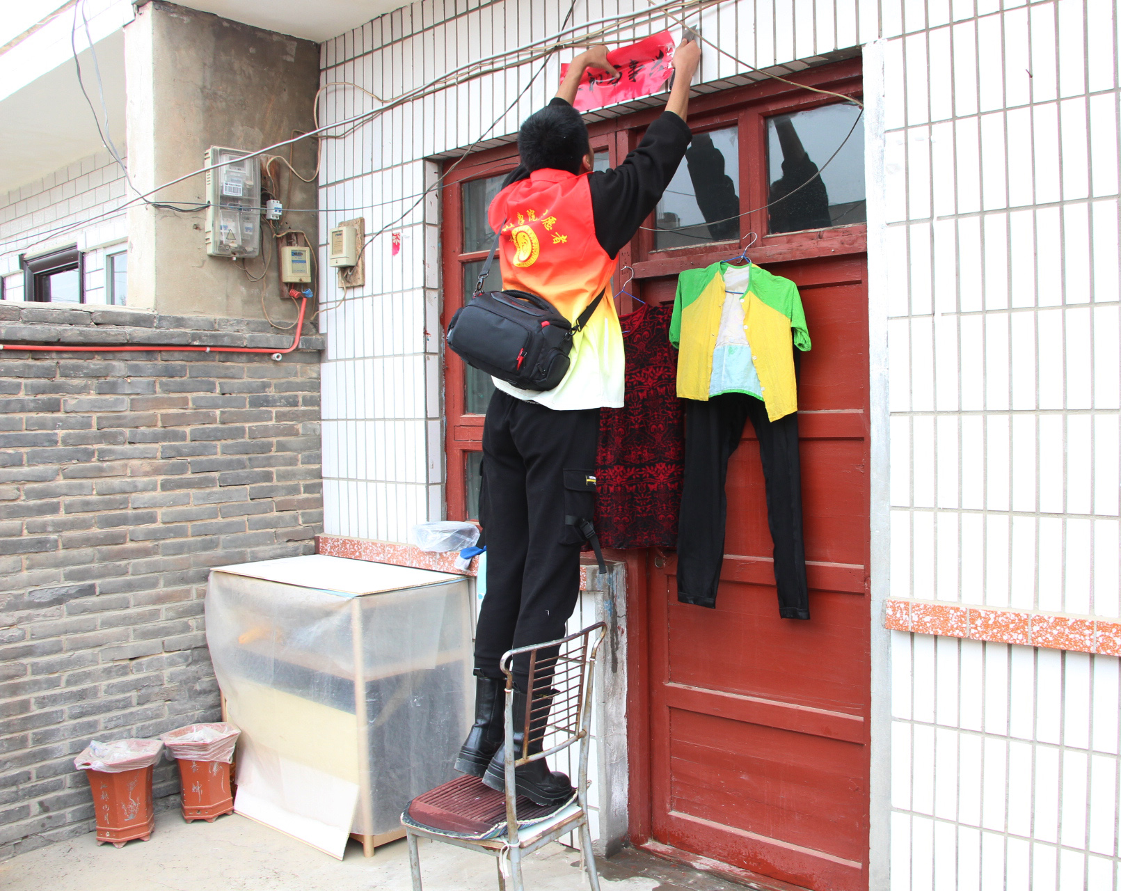 老师们带领志愿者帮助社区居民们打扫卫生,清理陈旧对联,给社区居民带来一个干净整洁的环境,志愿者们在社区传播文明新风,弘扬雷锋精神。