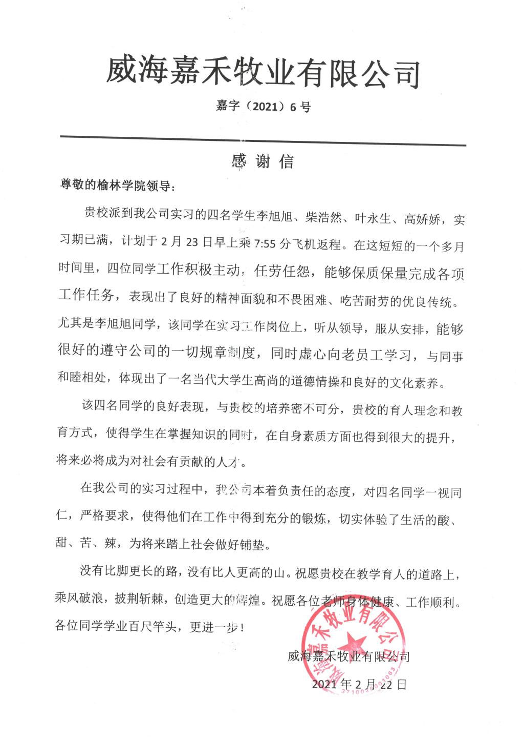 新学期伊始,公司18级动物科学专业同学的实习已经结束,派往山东威海嘉禾木业有限公司实习的四名同学以优异的实习表现受到了该公司的高度认可。威海嘉禾木业有限公司于今日就派遣优秀实习生一事向公司发来了感谢信。