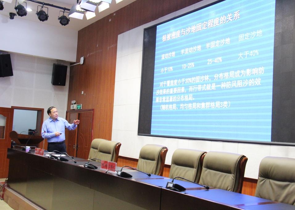 会上,冯起研究员以我国沙漠化问题和当前治沙成果为切入点,鼓励公司农林学子不忘初心、牢记使命、砥砺奋进,写好山水林田湖草系统治理大文章,为服务地方经济社会发展和乡村振兴战略实施提供强有力的人才支撑和科技支持。之后,冯起研究员从植被固沙机理、界面作用与植被土壤修复、低密度植被治沙模式和应用示范等方面对我国的沙地生态恢复工作做了详细介绍。针对我国干旱半干旱地区以及极端干旱地区的沙漠化问题,他们探索出高效的营林治沙模式,建立了符合中国沙地水分利用的管理模式。针对中国沙地生态系统、干旱地区造林的特点和沙地水土特性,将中国北方沙地划分成四个造林区,即种植乔木和灌木与发展高效农业和经济作物带、种植灌木为主带、种植旱地小灌木与草本带、保护与恢复自然绿洲带。以上的划分理论对西北地区防护林生态环境建设具有重要意义。