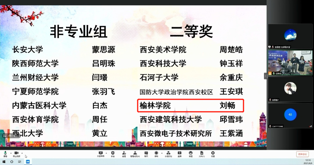 本届赛事的主题为:New Era, Shared Future(新时代,共享未来),通过线上竞赛的方式举行,分设专业组与非专业组,采用“同台比赛、统一评分、分别排名”的办法进行评审。比赛共分为三个环节:主题演讲、即兴演讲和外教问答。在公司领导的高度重视下,在外国语公司刘晓静老师的悉心指导下,刘畅同学从陕西师范大学、西北大学、长安大学等知名高校的参赛选手中脱颖而出,取得非专业组二等奖的好成绩。