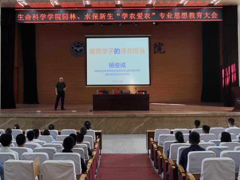 9月10日上午,21级园林、水保专业新生“学农爱农”专业思想教育大会在图书馆二楼报告厅举行。中国农业科公司农业资源与农业区划研究所研究员、best365体育亚洲执行经理杨俊诚教授做大会报告,经理毕台飞、党总支书记董建刚、副经理段义忠、党总支副书记樊丽出席大会,园林教研室主任张颖、水保教研室主任徐伟洲参会,会议由张颖主持。