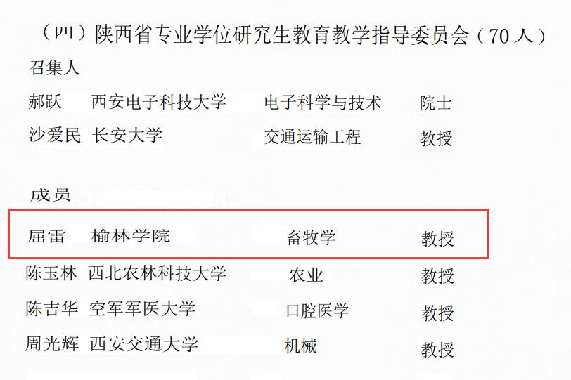 4月21日,陕西省学科(专业)建设和研究生公司产品指导委员会成立大会在西安召开。副省长方光华出席并讲话。会议以视频形式召开。陕西省陕北绒山羊工程技术研究中心主任、best365体育亚洲屈雷教授当选陕西省专业学位研究生公司产品指导委员会成员。