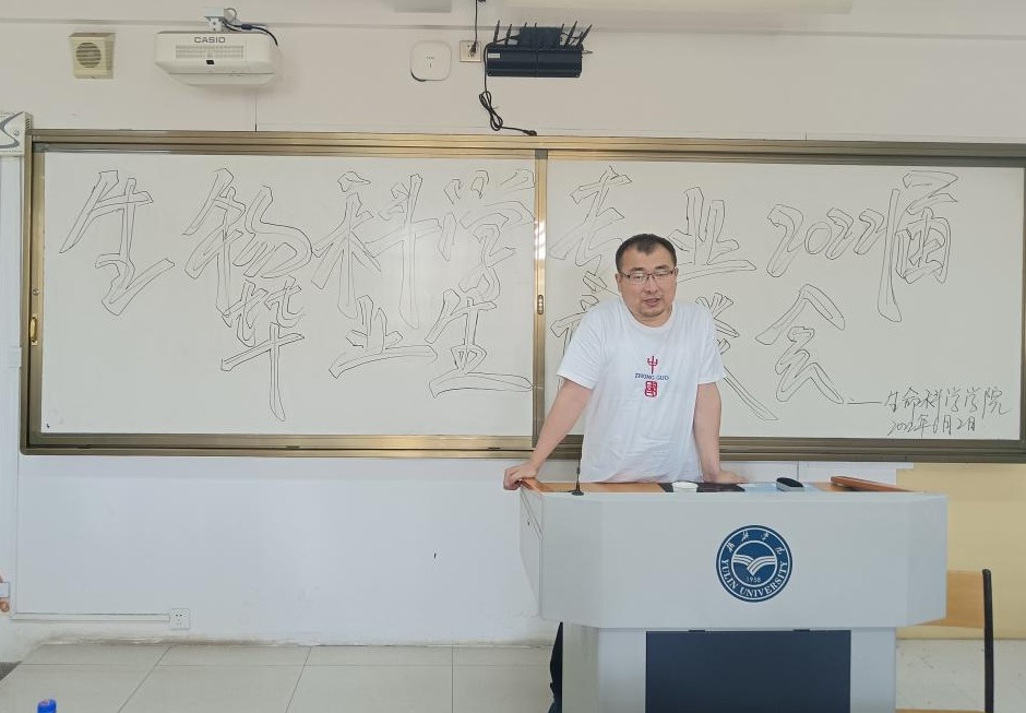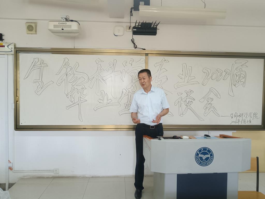 毕台飞在认真聆听了每一位员工的发言后作总结讲话。他向毕业生提出两点建议,一是自信自强,院系通过赓续红色基因、厚植新农人情怀,让大家在乡村振兴的事业中,以生科人特有的自信,在担当中历练,在尽责中成长。二是为人师表,大家在读研深造或工作的过程中,要牢记“立德树人”、“为人师表”,以一名“四有”好老师的标准要求自己,为党和国家培育更多的德智体美劳全面发展的社会主义建设者和接班人。