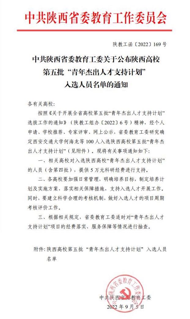 9月5日,中共陕西省教工委公布陕西高校第五批“青年杰出人才支持计划”入选人员名单的通知。best365体育亚洲严加坤副教授入选第五批“青年杰出人才支持计划”。