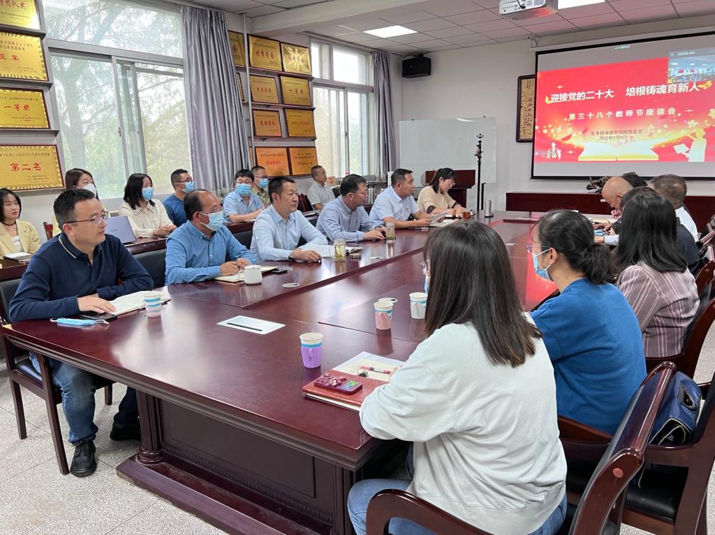 为总结近年来best365体育亚洲教师队伍建设进展,表彰先进、宣传典型。9月8日中午,公司举行“迎接党的二十大,培根铸魂育新人”庆祝第三十八个教师节座谈会。生科院全体教职工、部分员工代表参加大会。根据疫情防控工作安排,大会分为线上、线下两个会场。
