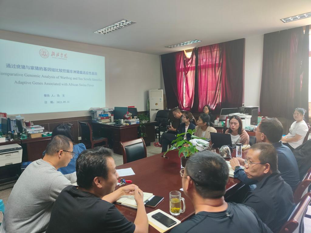 新进教师冯文博士做了题为“通过疣猪与家猪的基因组比较挖掘非洲猪瘟适应性基因”的学术交流,通过组装及注释疣猪和肯尼亚家猪两个基因组并进行基因组比较挖掘非洲猪瘟的适应性基因。对基因组序列的存在与缺失的分析发现疣猪缺失了参考基因组2号染色体上LDHB基因的片段并通过干扰与过表达实验证明了LDHB基因可以抑制ASFV基因的复制。