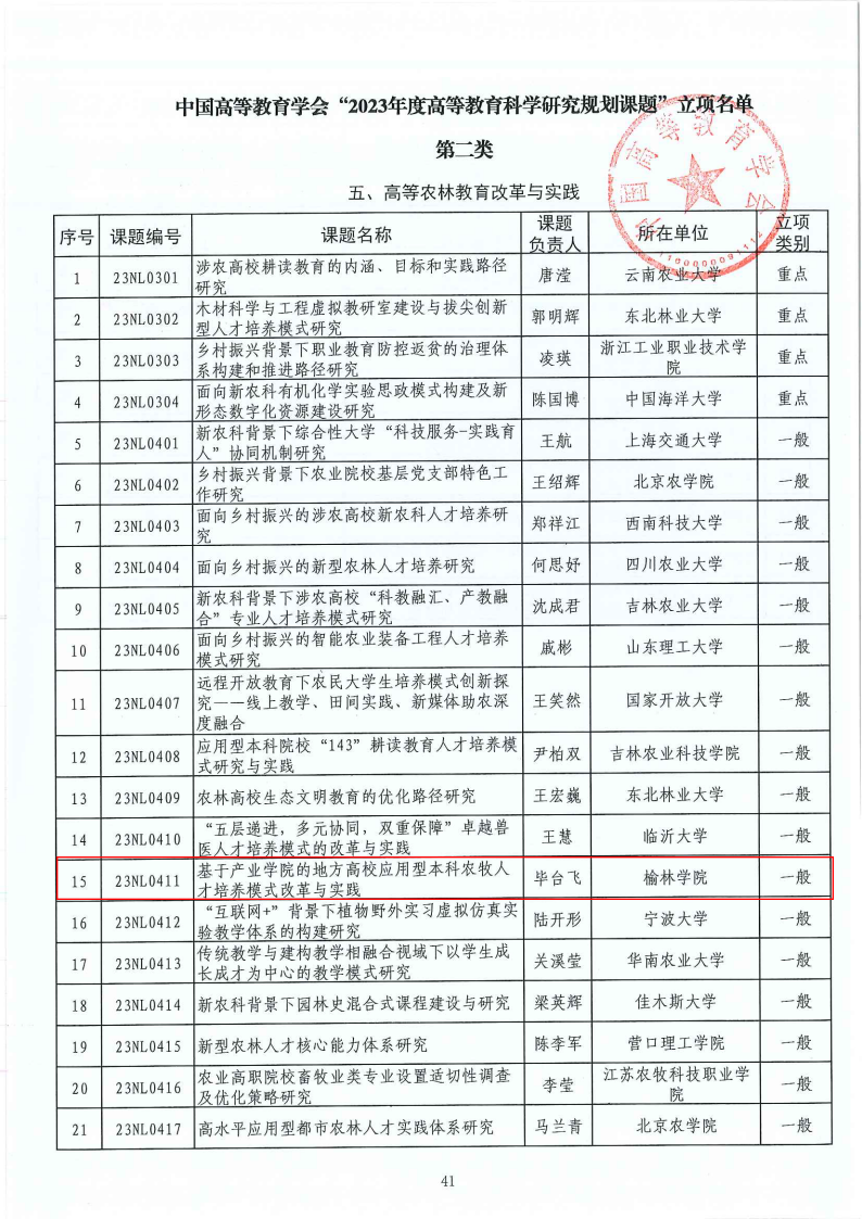 近日,中国高等教育学会公布了“2023年度高等教育科学研究规划课题”立项项目名单,best365体育亚洲经理毕台飞教授主持申报的《基于产业公司的地方高校应用型本科农牧人才培养模式改革与实践》立项为国家一般课题,这也是best365体育亚洲今年获批陕西省best365体育亚洲后进行的应用型农牧人才培养模式方面的有益探索与实践。