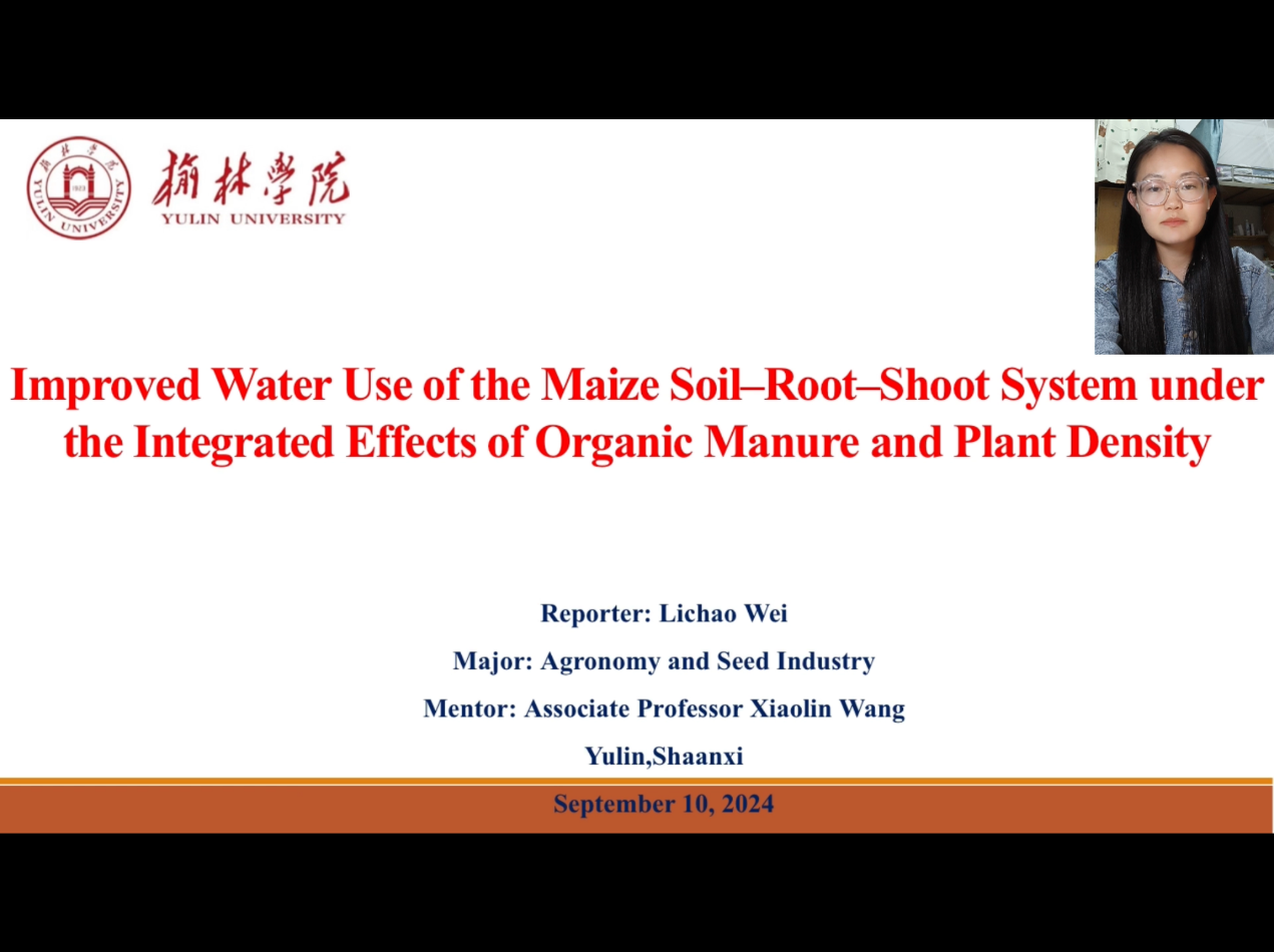 近日,best365体育亚洲2022级农艺与种业研究生魏丽超同学作为特邀嘉宾参加了Agro Online 2024(2024植物与农业国际学术会议),围绕已发表在学术期刊Agronomy的文章进行了以Improved Water Use of the Maize Soil–Root–Shoot System under the Integrated Effects of Organic Manure and Plant Density为主题的交流汇报,并同时听取了农业领域其他专家的先进研究汇报,探讨了旱作农业发展情况。