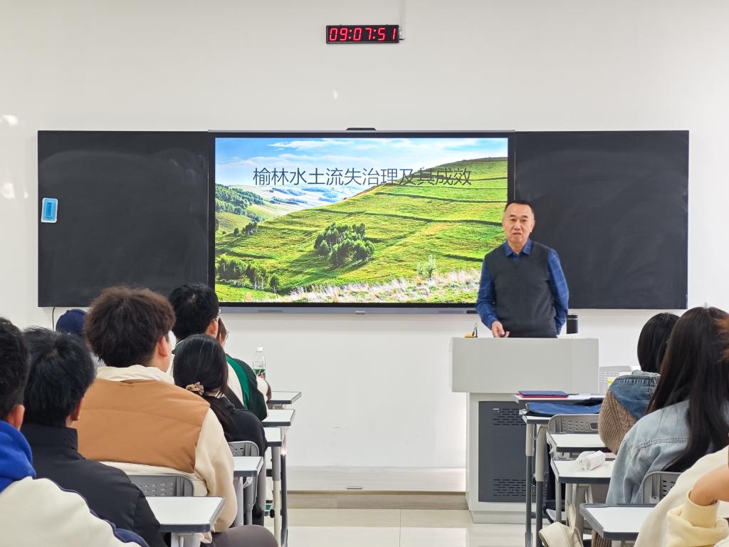 杨思炯回顾了榆林治水治沙的历史,生动地讲述了新中国成立以来榆林市水利水保人在治水治沙中面临的困难、取得的成就,并对未来工作进行了展望。报告会中,他与师生深入探讨了榆林市在全国水土保持工作中的区位重要性,榆林市独特的自然条件给水土保持工作带来的困难以及应对策略,详细展示了米脂县高西沟、榆阳赵家峁、子洲县佛殿堂、横山区元坪坝系等典型案例背后的实践知识,力证了水土保持工作在新形势下助力乡村振兴、实现“双碳”目标中的重要性和实践贡献。