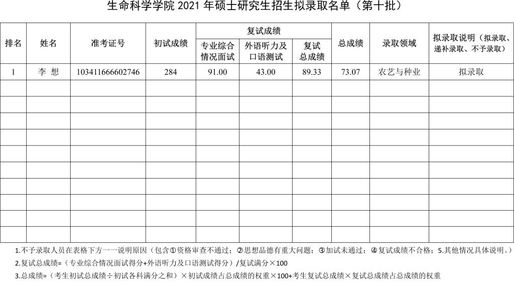 公司于2021年4月20日组织了硕士研究生招生第十批调剂复试录取工作。根据最终成绩,经院系评定,研究生院审核并报校招生工作领导小组审定,现将拟录取名单予以公示,如有异议,请于2021年4月30日前以书面形式报公司研究生招生办公室,逾期不予受理。