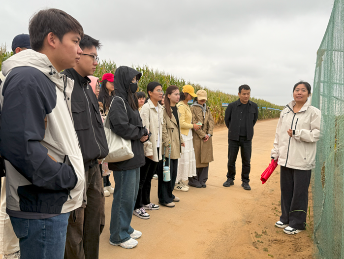 在榆林市农业科学研究院,李振娇老师带领新生们走进杂粮种质资源圃与玉米试验基地,近距离观察陕北特色作物生长状态,详细了解品种选育、旱作栽培等关键技术环节,并结合自身研究的谷子和糜子,现场解读“科研要扎根生产一线”的实践意义,鼓励新生以区域农业需求为导向深耕专业。在大漠神农教育实践基地,基地技术人员介绍樱桃的品种筛选、温室调控及水肥一体化管理等关键技术。最后严经理强调:“专业学位培养需打通理论、科研与实践的壁垒,扎根陕北大地,要像培育优良品种一样锤炼自身能力。”并鼓励新生以“四链融合”理念锤炼实践能力。新生们纷纷表示,实地观摩使专业认知从书本走向田间,深入了解农业技术推广与科普教育的实践路径,更明晰了服务区域农业的责任。